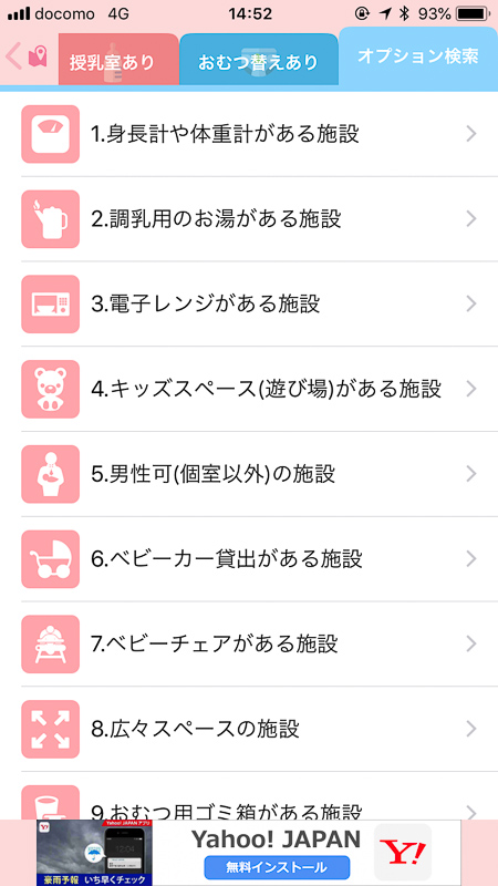 身長計や体重計がある施設、調乳用のお湯がある施設など条件から検索することもできます。