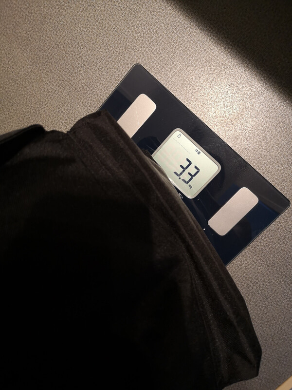 無印良品のバッグに入れて体重計にのせたところ、総重量3.3kg。