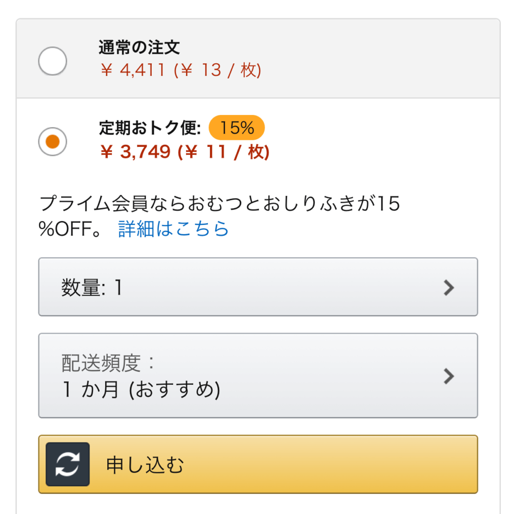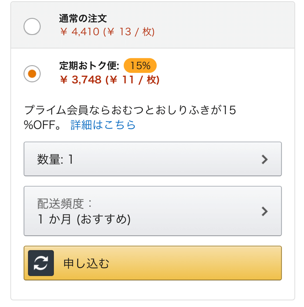定期便を利用することによっておむつとおしりふきが、表示価格からさらに15%オフになることです。
