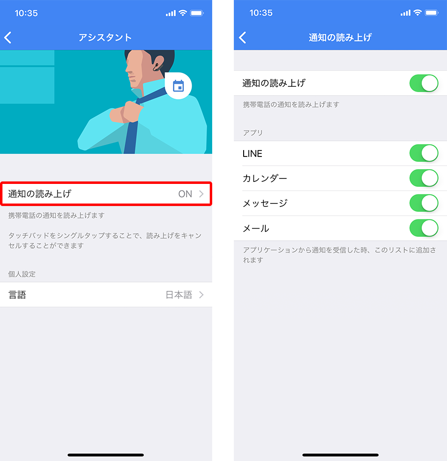 また「Android」は最初から対応していたのですが、先月から「iPhone」での読み上げ機能に対応しました。アプリに幅があるとは言えませんが、「LINE」や「メール」を受信すると、「Xperia Ear Duo」がその内容を音声で教えてくれます。