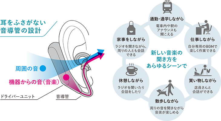 「Xperia Ear Duo」は形状的にまず耳を塞がない仕様になっています。さらに、耳の上を通して装着しないので、耳の部分が痛くなりにくい。そして「デュアルリスニング」に対応しているので、「周囲の音」を遮断することなく、「音楽」もしっかり聞くことができます。また音質が不安になる方もいらっしゃると思いますが、さすがそこはSONY。