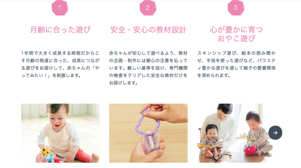 初めての子育てで不安が多く、何か指針が欲しいな〜と思っていたし、たくさんのモニターでテストして月齢に沿ったおもちゃを専門家が選んでくれるというのはとても興味が湧きました。