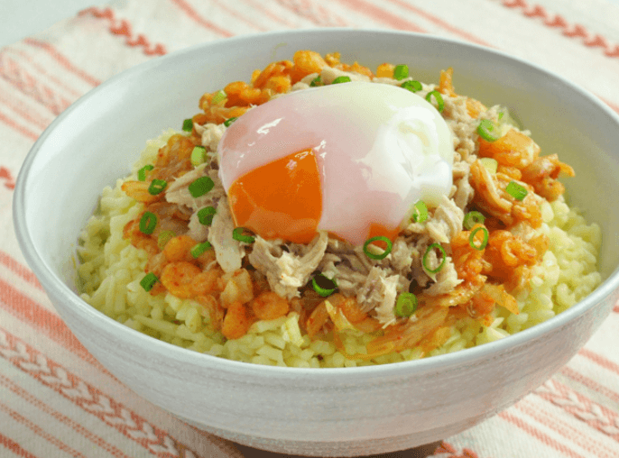 糖質0麺を刻んでレンチンして、ツナ、キムチ、卵、ごま油ををかけるだけ。