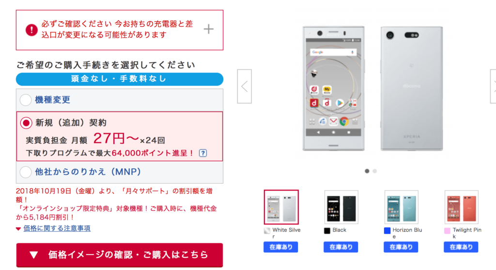 Xperia XZ1 Compactをドコモオンラインショップでチェックする。
