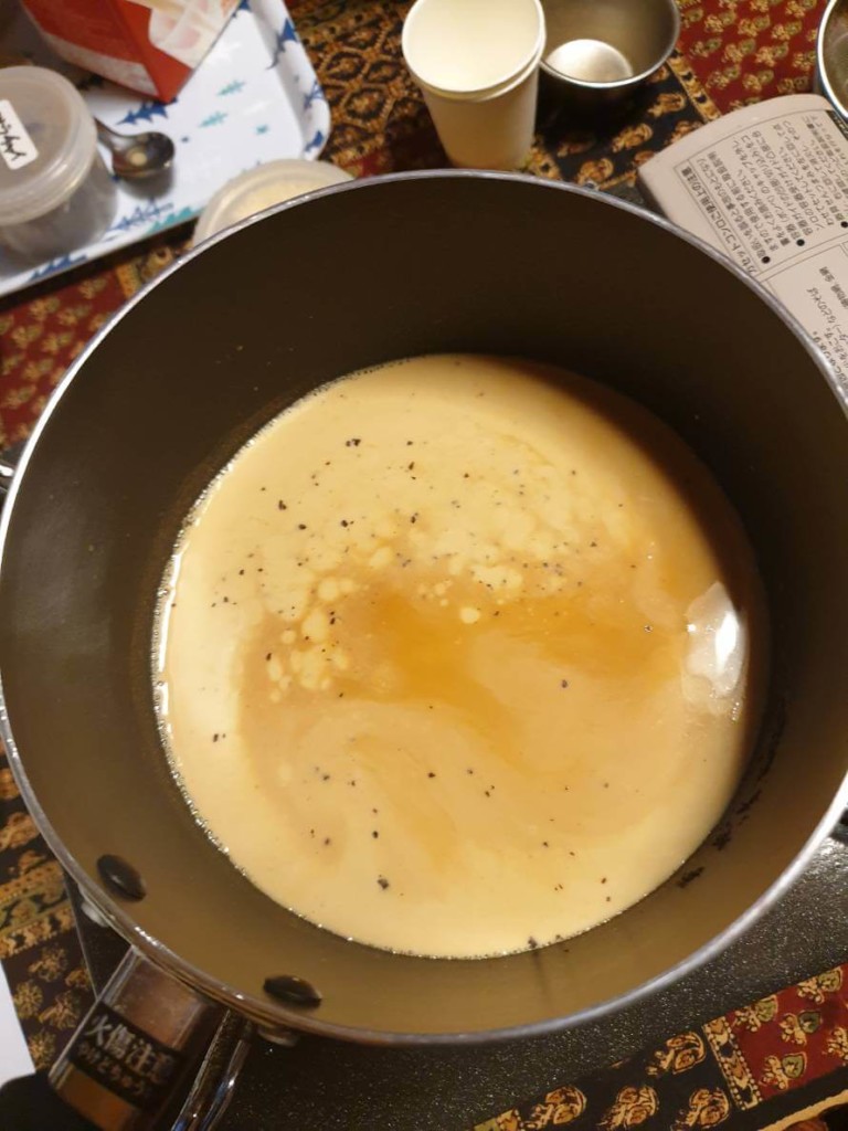 - 牛乳を加えて強火にし、沸騰直前で弱火にする