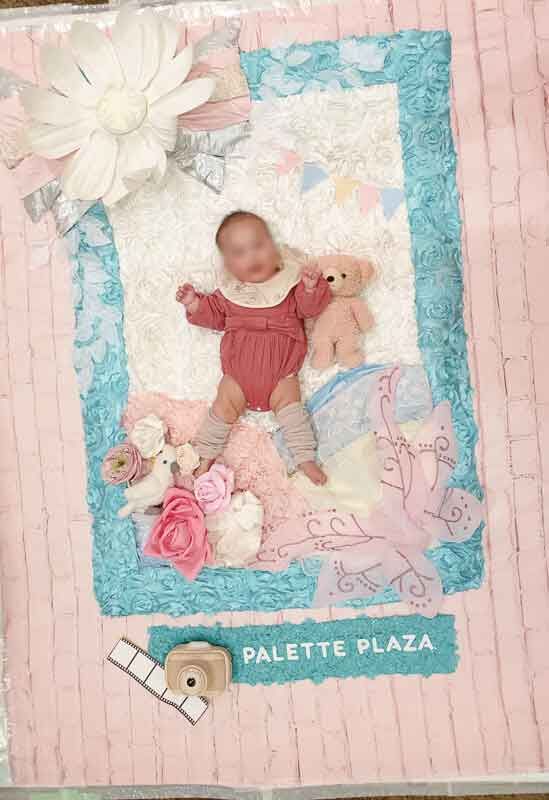 おひるねアートは、アートセットに寝ている赤ちゃんをママが椅子の上から撮影します。