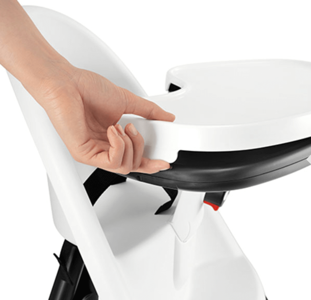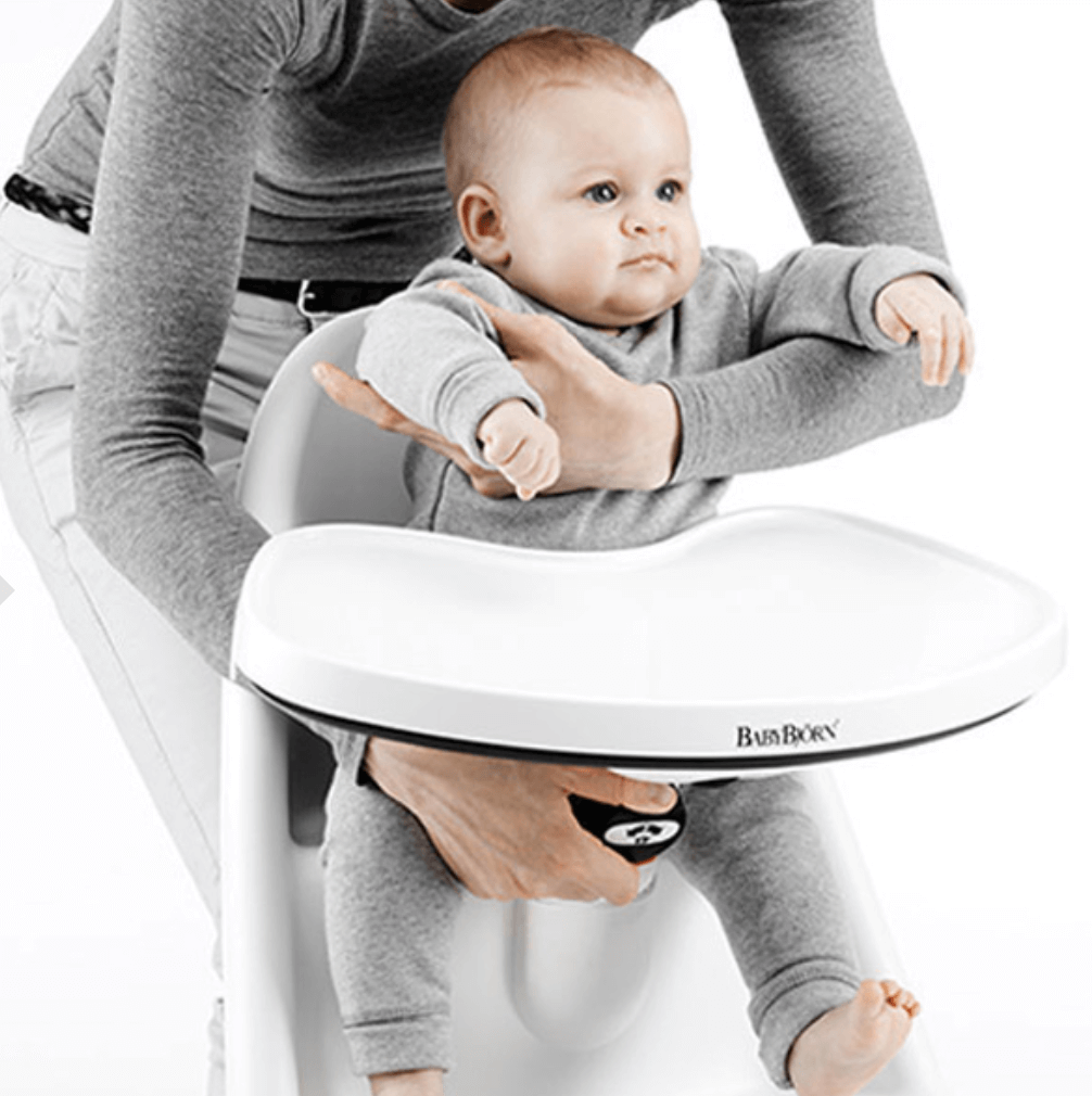 ベビービョルンハイチェアは、テーブルを前後にスライドさせ、お腹にそってぴったりと保持。