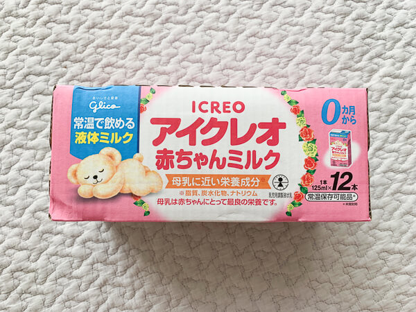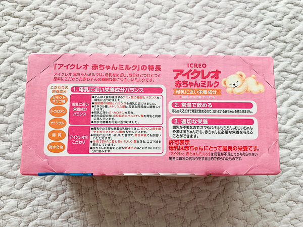 まず外箱から確認したいと思います。「粉ミルク」でお馴染みの「アイクレオ」と基本同じデザインをしていますよね。
