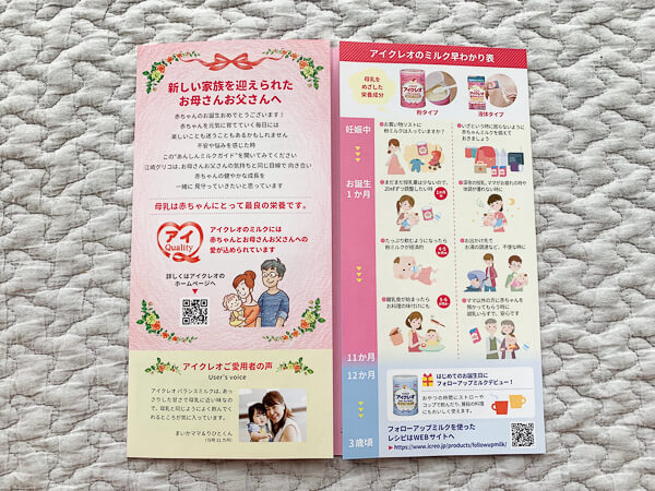 今回「グリコ」の「オンラインショップ」で購入しましたが、「保存版」の「母乳ガイド」が一緒に同梱されていましたが。簡単にいえば、「粉ミルク」と「液体ミルク」のおすすめの使用方法が書いてあります。
