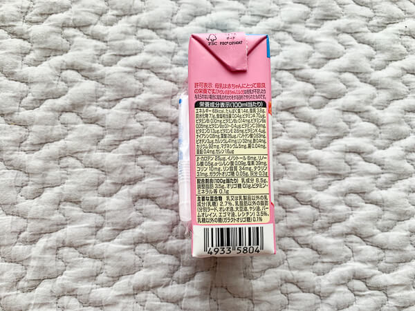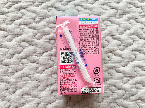 背面はこんな感じ。使い方が書いてあります。で、衝撃的なのが、基本的に「哺乳瓶」に移し替えることが前提に。特段希釈する必要性はないみたいですが、すぐに飲んで余ったら捨ててと書いてあります。ちなみに「アレルギー」は「乳成分」と「大豆」