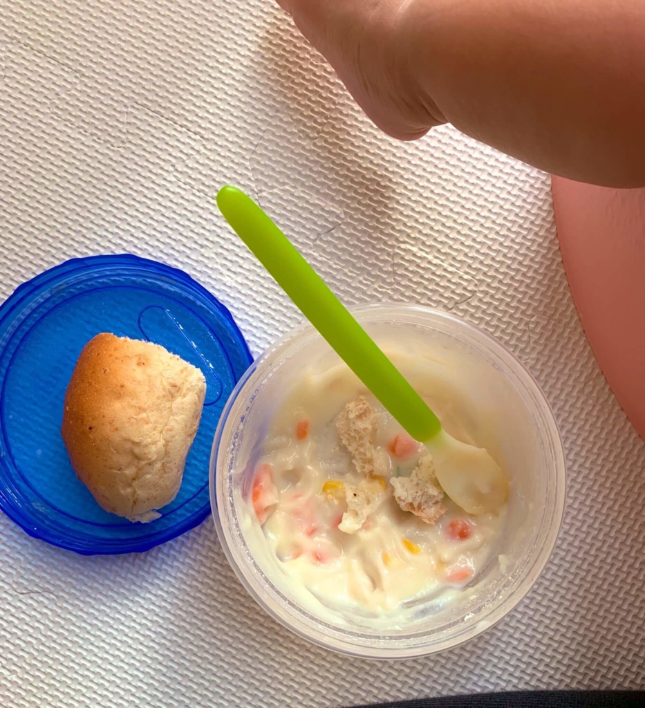 パンをちぎって食べられるようになってきたので、朝ごはんにシチューも一緒に出してみた。