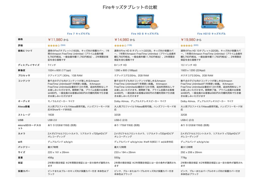 | Fire7キッズモデル | FireHD 8 キッズモデル | FireHD10キッズモデル | |