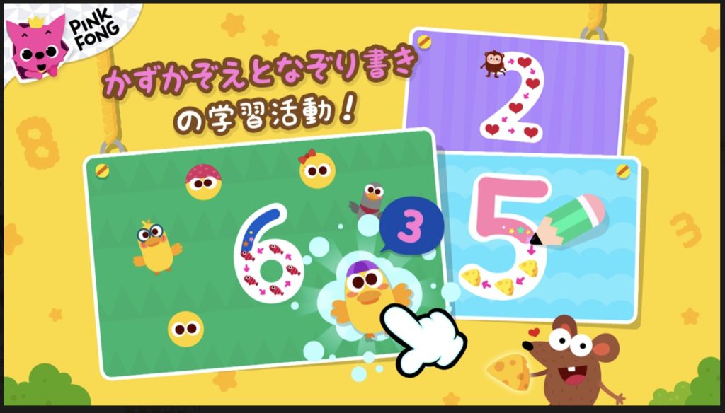 また、それぞれの数字にまつわるゲーム(動物に食べ物を食べさせる)、数字を書いたりして数を覚えることができます。