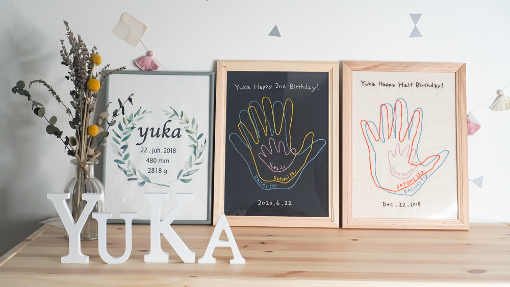 ハーフバースデイに続き、娘の2歳を記念して親子3人の手形刺繍をオーダーしました。